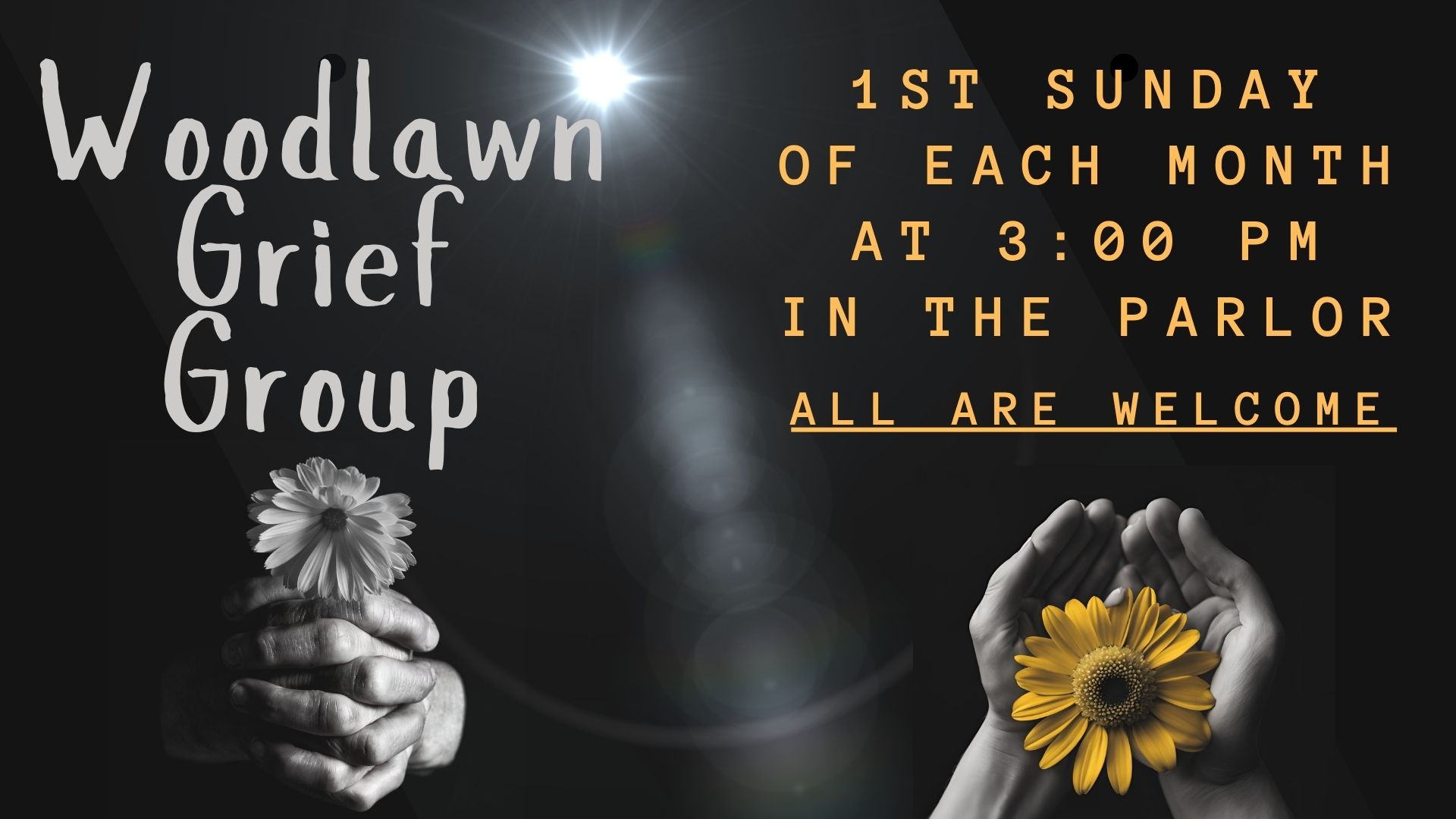 You’re warmly invited to join the Woodlawn Grief Group, a supportive space for those navigating loss. We meet on the 1st Sunday of each month at 3:00 PM in the parlor. All are welcome—come as you are.